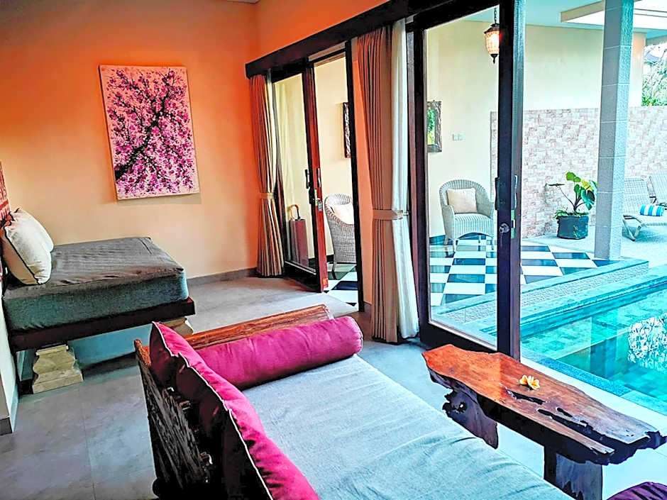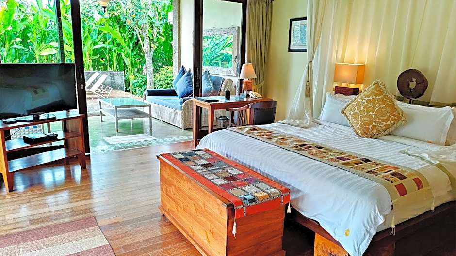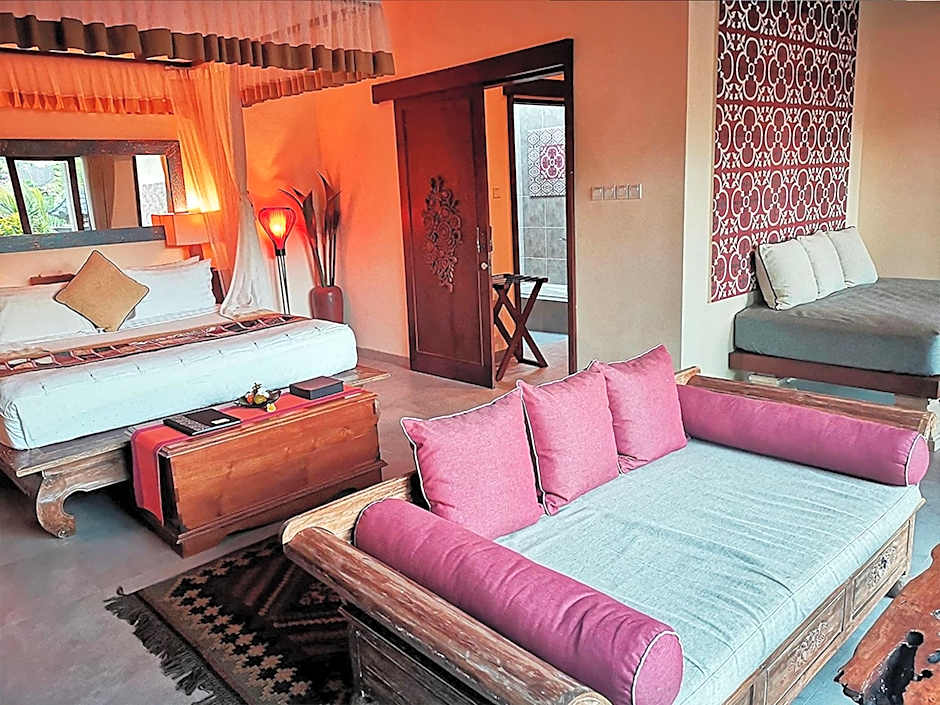 It is a spacious 1-bedroom villa with a beautiful garden and its own private pool. It has a dressing room, a Balinese-style semi-outdoor bathroom with a full bath, a patio where meals can be served as well as a sit out /decking area. Fully air conditioned, the bedroom has a super-king size bed and a day bed. The villa comes with hi-speed internet access/wifi and satellite tv.